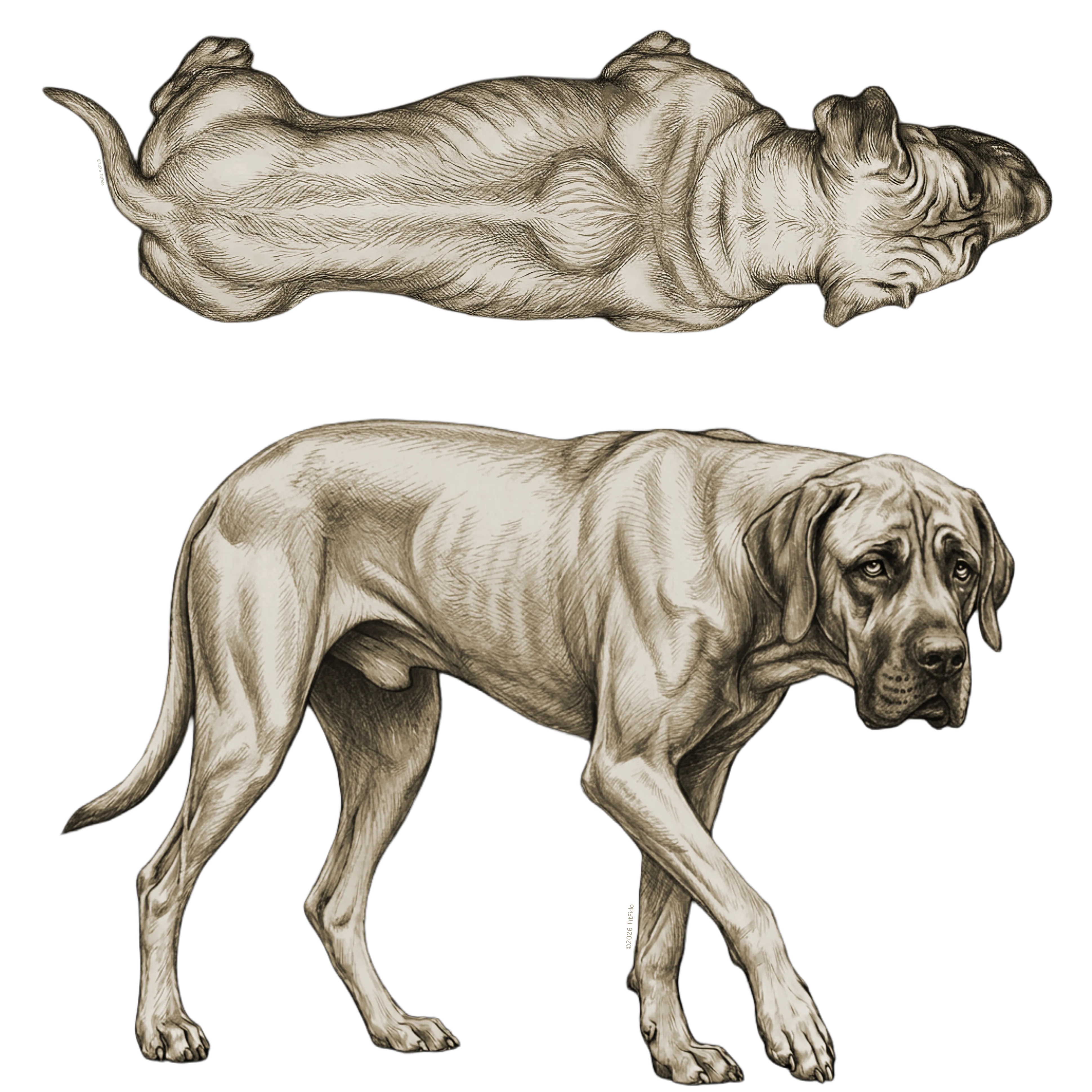 Massive fat deposits over thorax, spine and tail base, waist absent, abdomen obviously distended